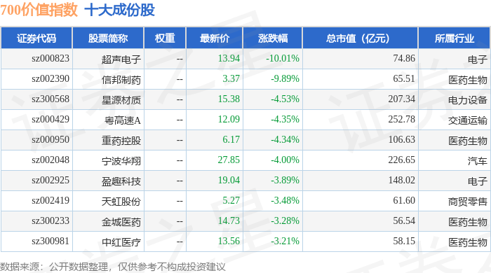 证券之星消息,12月12日,700价值(399629)指数报收于2819.28点,涨0.09%,成交534.09亿元,换手率2.06%。当日该指数成份股中,上涨的有104家,良信股份以5.16%的涨幅领涨,下跌的有120家,超声电子以10.01%的跌幅领跌。