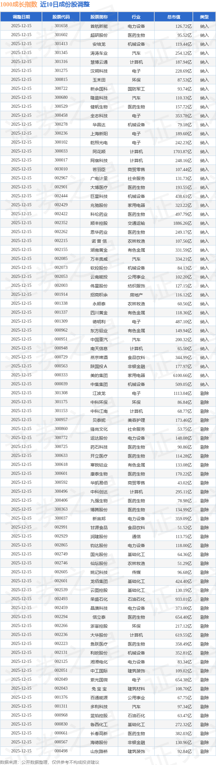1000成长(399630)指数十大成份股详情如下: