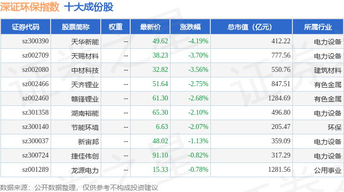 证券之星消息,12月12日,深证环保(399638)指数报收于7511.6点,涨0.38%,成交756.63亿元,换手率1.58%。当日该指数成份股中,上涨的有26家,惠城环保以4.16%的涨幅领涨,下跌的有12家,天华新能以4.19%的跌幅领跌。