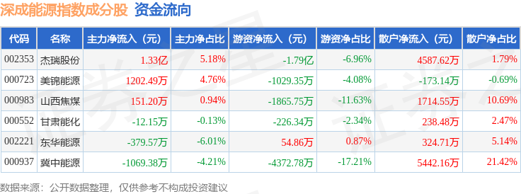 资金流向方面,深成能源(399680)指数成份股当日主力资金净流入合计1.32亿元,游资资金净流出合计2.53亿元,散户资金净流入合计1.21亿元。成份股资金流向详情见下表: