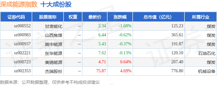 证券之星消息,12月12日,深成能源(399680)指数报收于780.87点,涨2.08%,成交33.94亿元,换手率1.14%。当日该指数成份股中,上涨的有2家,杰瑞股份以4.69%的涨幅领涨,下跌的有4家,甘肃能化以1.68%的跌幅领跌。