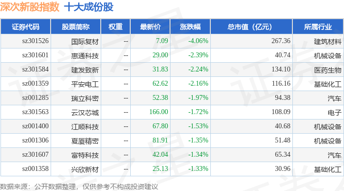 资金流向方面,深次新股(399678)指数成份股当日主力资金净流出合计4.01亿元,游资资金净流入合计1.09亿元,散户资金净流入合计2.92亿元。成份股资金流向详情见下表: