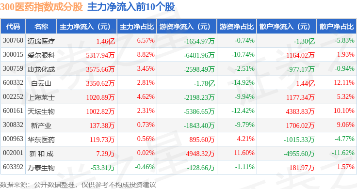 资金流向方面,300医药(399913)指数成份股当日主力资金净流出合计9.97亿元,游资资金净流入合计2.9亿元,散户资金净流入合计7.06亿元。成份股资金流向详情见下表: