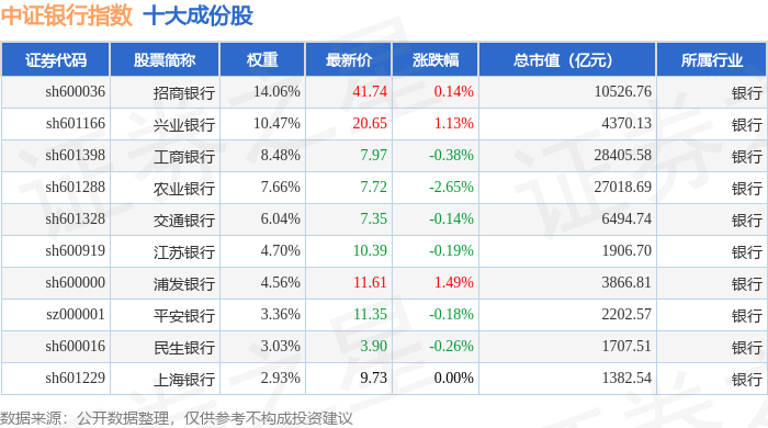 证券之星消息,12月12日,中证银行(399986)指数报收于7531.87点,跌0.26%,成交379.34亿元,换手率0.37%。当日该指数成份股中,上涨的有6家,浦发银行以1.49%的涨幅领涨,下跌的有32家,农业银行以2.65%的跌幅领跌。
