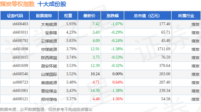 证券之星消息,12月12日,煤炭等权(399990)指数报收于2935.93点,跌0.28%,成交91.86亿元,换手率1.03%。当日该指数成份股中,上涨的有7家,华阳股份以4.17%的涨幅领涨,下跌的有22家,苏能股份以2.35%的跌幅领跌。