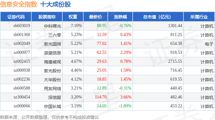 信息安全(399994)指数十大成份股详情如下: