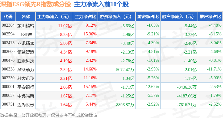 资金流向方面,深指ESG领先R(470029)指数成份股当日主力资金净流出合计26.42亿元,游资资金净流出合计21.8亿元,散户资金净流入合计48.22亿元。成份股资金流向详情见下表: