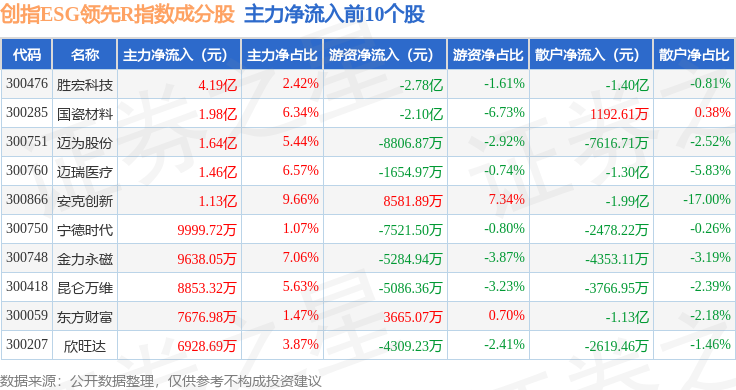 资金流向方面,创指ESG领先R(470031)指数成份股当日主力资金净流出合计25.33亿元,游资资金净流入合计7.91亿元,散户资金净流入合计17.42亿元。成份股资金流向详情见下表: