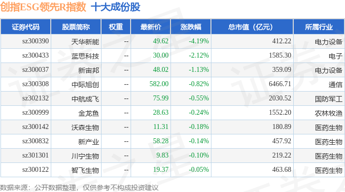 创指ESG领先R(470031)指数十大成份股详情如下: