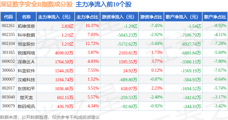 资金流向方面,深证数字安全R(470052)指数成份股当日主力资金净流出合计2.67亿元,游资资金净流出合计4.35亿元,散户资金净流入合计7.02亿元。成份股资金流向详情见下表:
