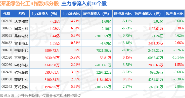 资金流向方面,深证绿色化工R(470076)指数成份股当日主力资金净流出合计1.74亿元,游资资金净流出合计5.87亿元,散户资金净流入合计7.61亿元。成份股资金流向详情见下表: