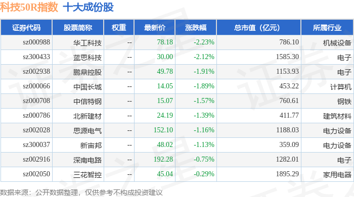 证券之星消息,12月12日,科技50R(470080)指数报收于3754.51点,涨0.65%,成交1219.36亿元,换手率1.8%。当日该指数成份股中,上涨的有38家,德赛西威以4.8%的涨幅领涨,下跌的有11家,华工科技以2.23%的跌幅领跌。