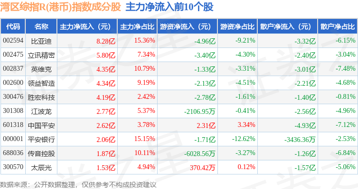 资金流向方面,湾区综指R(港币)(480004)指数成份股当日主力资金净流出合计11.46亿元,游资资金净流出合计22.33亿元,散户资金净流入合计33.13亿元。成份股资金流向详情见下表: