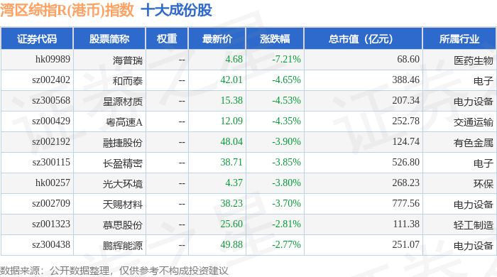 湾区综指R(港币)(480004)指数十大成份股详情如下: