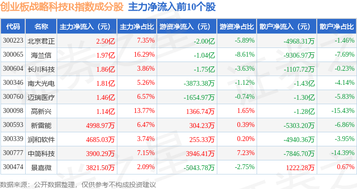 资金流向方面,创业板战略科技R(471004)指数成份股当日主力资金净流入合计9.61亿元,游资资金净流出合计7.94亿元,散户资金净流出合计1.67亿元。成份股资金流向详情见下表: