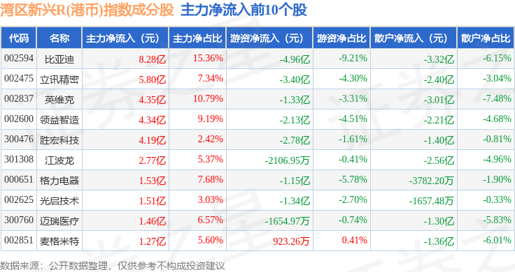 资金流向方面,湾区新兴R(港币)(480008)指数成份股当日主力资金净流出合计11.03亿元,游资资金净流出合计14.72亿元,散户资金净流入合计25.75亿元。成份股资金流向详情见下表: