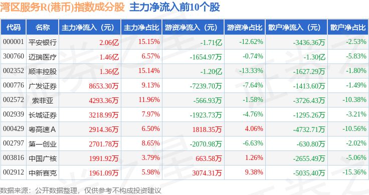 资金流向方面,湾区服务R(港币)(480012)指数成份股当日主力资金净流入合计3.39亿元,游资资金净流出合计3.24亿元,散户资金净流出合计1581.34万元。成份股资金流向详情见下表: