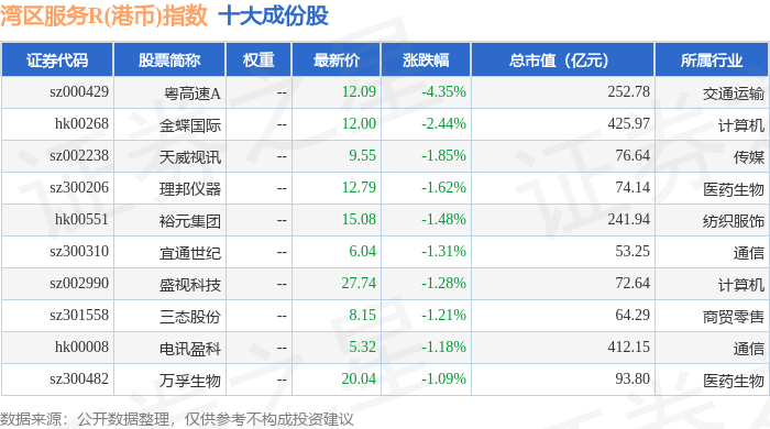 湾区服务R(港币)(480012)指数十大成份股详情如下:
