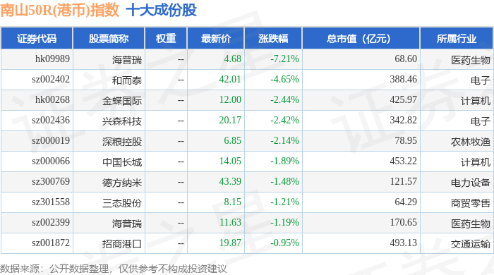 南山50R(港币)(480024)指数十大成份股详情如下: