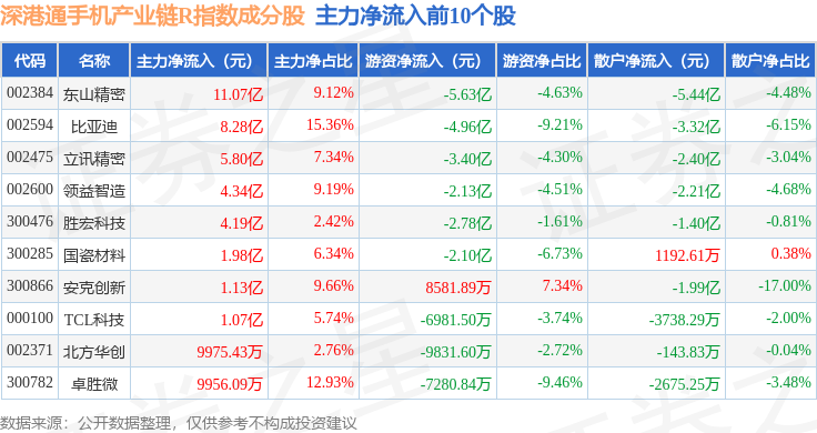 资金流向方面,深港通手机产业链R(483009)指数成份股当日主力资金净流出合计1.66亿元,游资资金净流出合计16.39亿元,散户资金净流入合计18.05亿元。成份股资金流向详情见下表: