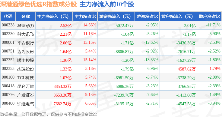 资金流向方面,深港通绿色优选R(483011)指数成份股当日主力资金净流出合计8.91亿元,游资资金净流出合计11.16亿元,散户资金净流入合计20.07亿元。成份股资金流向详情见下表: