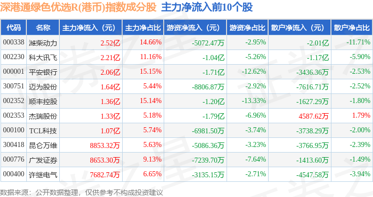 资金流向方面,深港通绿色优选R(港币)(483012)指数成份股当日主力资金净流出合计8.91亿元,游资资金净流出合计11.16亿元,散户资金净流入合计20.07亿元。成份股资金流向详情见下表: