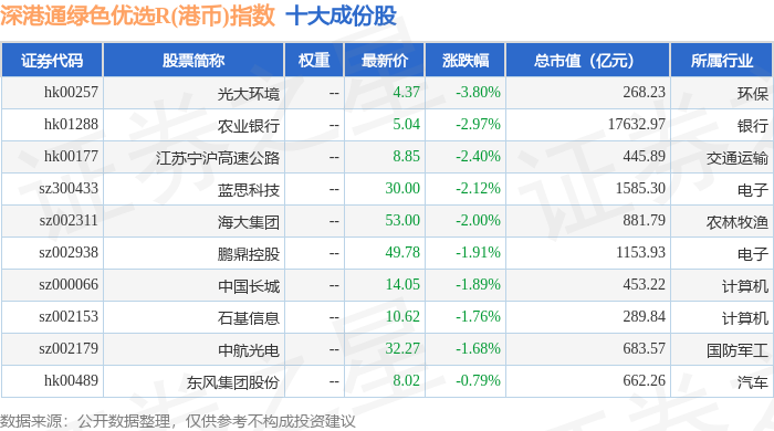 深港通绿色优选R(港币)(483012)指数十大成份股详情如下: