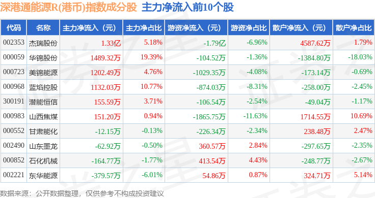 资金流向方面,深港通能源R(港币)(483014)指数成份股当日主力资金净流入合计1.36亿元,游资资金净流出合计2.45亿元,散户资金净流入合计1.09亿元。成份股资金流向详情见下表: