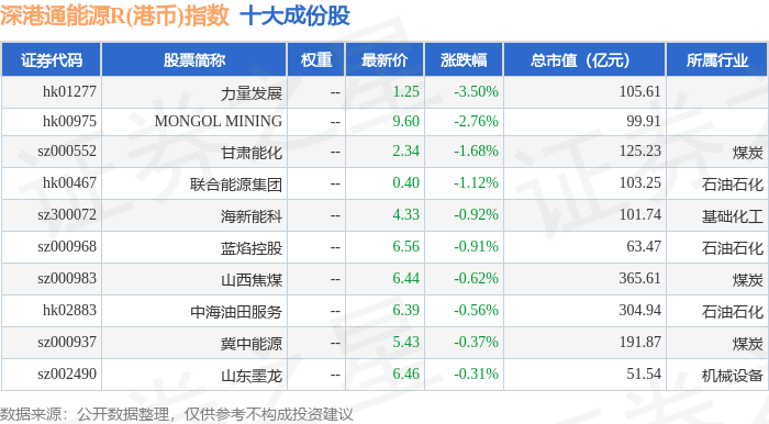 深港通能源R(港币)(483014)指数十大成份股详情如下:
