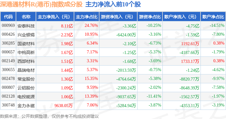 资金流向方面,深港通材料R(港币)(483016)指数成份股当日主力资金净流出合计6.92亿元,游资资金净流出合计8.72亿元,散户资金净流入合计15.64亿元。成份股资金流向详情见下表: