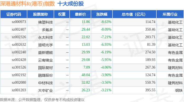 深港通材料R(港币)(483016)指数十大成份股详情如下: