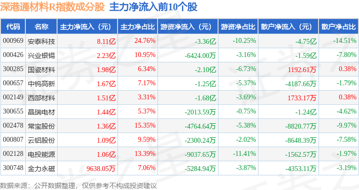资金流向方面,深港通材料R(483015)指数成份股当日主力资金净流出合计6.92亿元,游资资金净流出合计8.72亿元,散户资金净流入合计15.64亿元。成份股资金流向详情见下表: