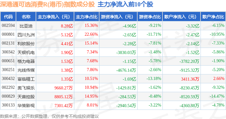 资金流向方面,深港通可选消费R(港币)(483020)指数成份股当日主力资金净流入合计2.69亿元,游资资金净流出合计20.35亿元,散户资金净流入合计17.66亿元。成份股资金流向详情见下表:
