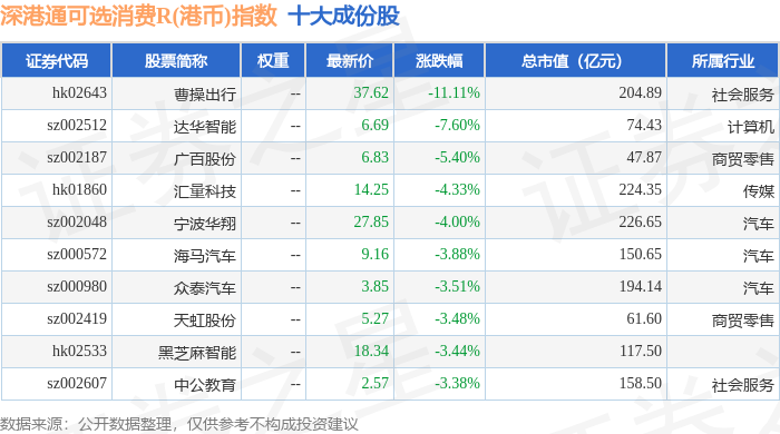 深港通可选消费R(港币)(483020)指数十大成份股详情如下: