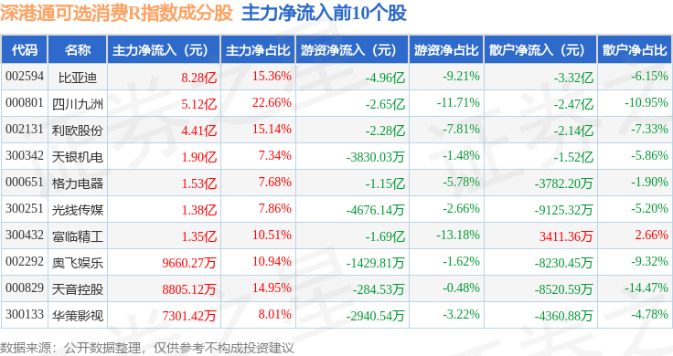 资金流向方面,深港通可选消费R(483019)指数成份股当日主力资金净流入合计2.69亿元,游资资金净流出合计20.35亿元,散户资金净流入合计17.66亿元。成份股资金流向详情见下表: