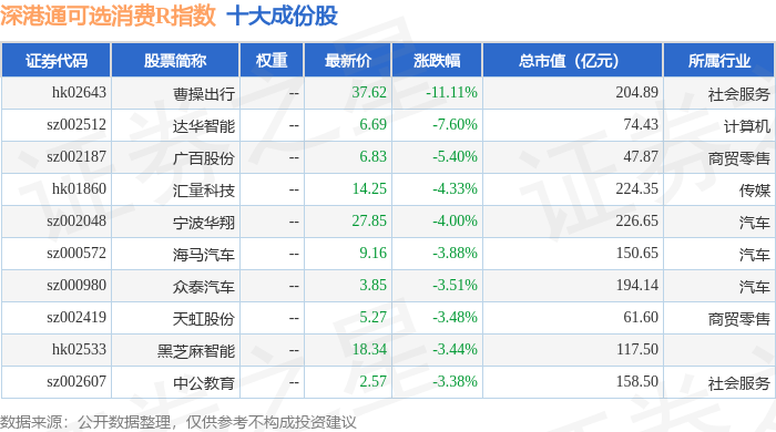 深港通可选消费R(483019)指数十大成份股详情如下: