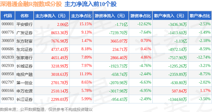 资金流向方面,深港通金融R(483025)指数成份股当日主力资金净流入合计5.25亿元,游资资金净流出合计3.65亿元,散户资金净流出合计1.6亿元。成份股资金流向详情见下表: