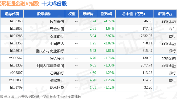 证券之星消息,12月12日,深港通金融R(483025)指数报收于10715.29点,涨1.31%,成交402.36亿元,换手率0.43%。当日该指数成份股中,上涨的有71家,中国银河以6.97%的涨幅领涨,下跌的有19家,远东宏信以4.77%的跌幅领跌。