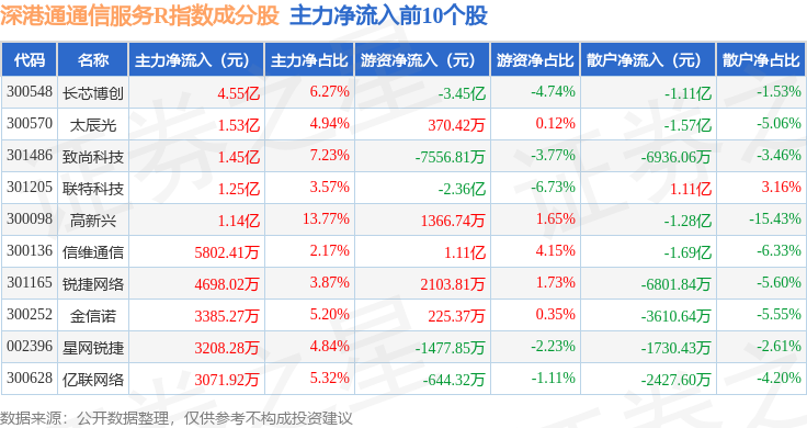 资金流向方面,深港通通信服务R(483033)指数成份股当日主力资金净流出合计24.59亿元,游资资金净流入合计7.89亿元,散户资金净流入合计16.7亿元。成份股资金流向详情见下表: