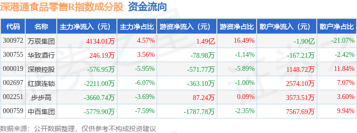 资金流向方面,深港通食品零售R(483037)指数成份股当日主力资金净流出合计7848.41万元,游资资金净流入合计1.22亿元,散户资金净流出合计4350.22万元。成份股资金流向详情见下表: