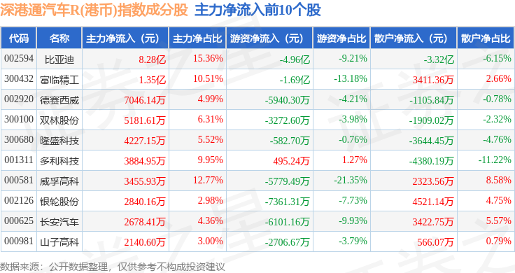 资金流向方面,深港通汽车R(港币)(483040)指数成份股当日主力资金净流入合计1.62亿元,游资资金净流出合计11.25亿元,散户资金净流入合计9.63亿元。成份股资金流向详情见下表: