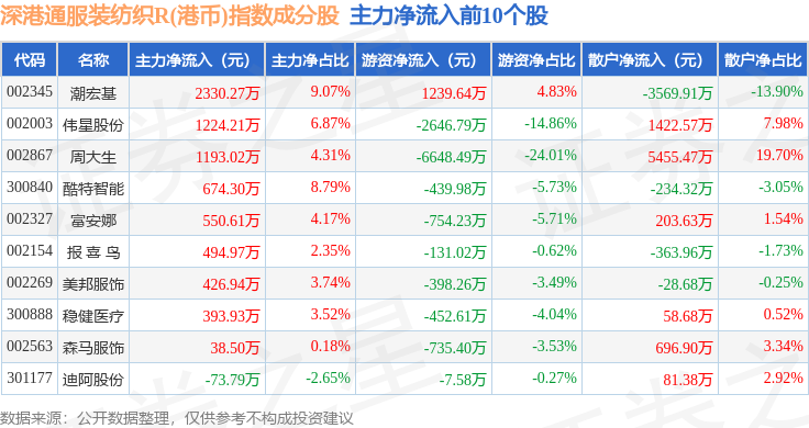 资金流向方面,深港通服装纺织R(港币)(483042)指数成份股当日主力资金净流出合计3293.73万元,游资资金净流出合计4257.01万元,散户资金净流入合计7550.75万元。成份股资金流向详情见下表: