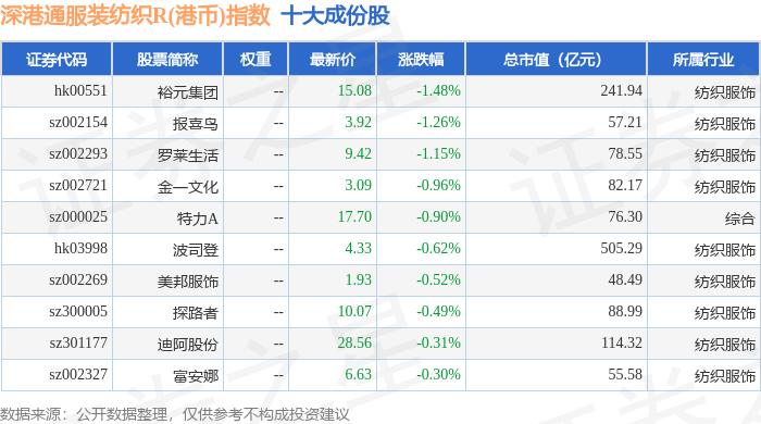 深港通服装纺织R(港币)(483042)指数十大成份股详情如下:
