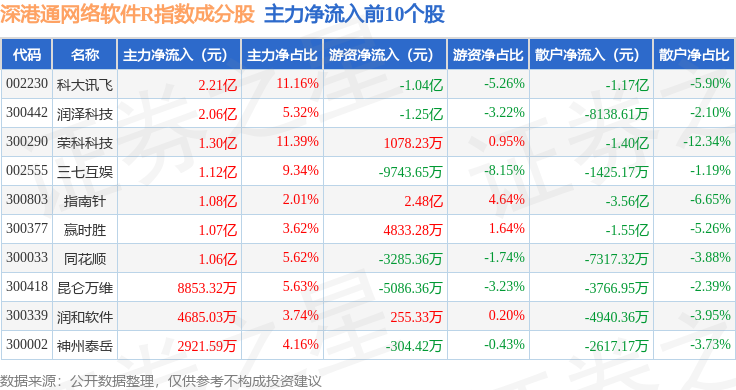 资金流向方面,深港通网络软件R(483047)指数成份股当日主力资金净流出合计3.01亿元,游资资金净流出合计2.86亿元,散户资金净流入合计5.87亿元。成份股资金流向详情见下表: