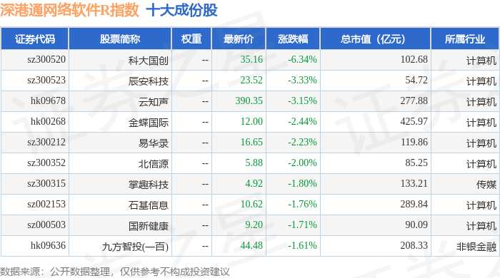 深港通网络软件R(483047)指数十大成份股详情如下: