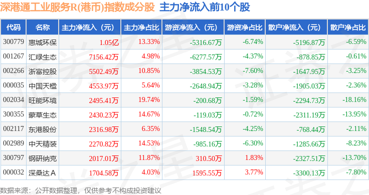 资金流向方面,深港通工业服务R(港币)(483056)指数成份股当日主力资金净流出合计9002.64万元,游资资金净流出合计3.68亿元,散户资金净流入合计4.58亿元。成份股资金流向详情见下表:
