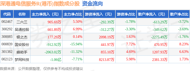 资金流向方面,深港通电信服务R(港币)(483058)指数成份股当日主力资金净流出合计1.18亿元,游资资金净流入合计1.1亿元,散户资金净流入合计821.81万元。成份股资金流向详情见下表: