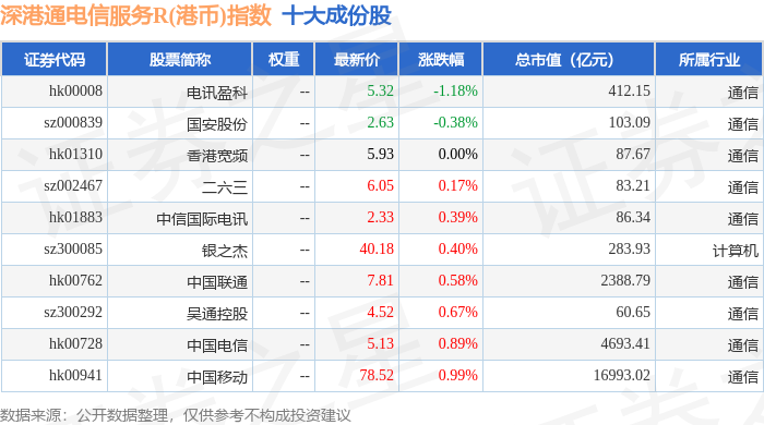 深港通电信服务R(港币)(483058)指数十大成份股详情如下:
