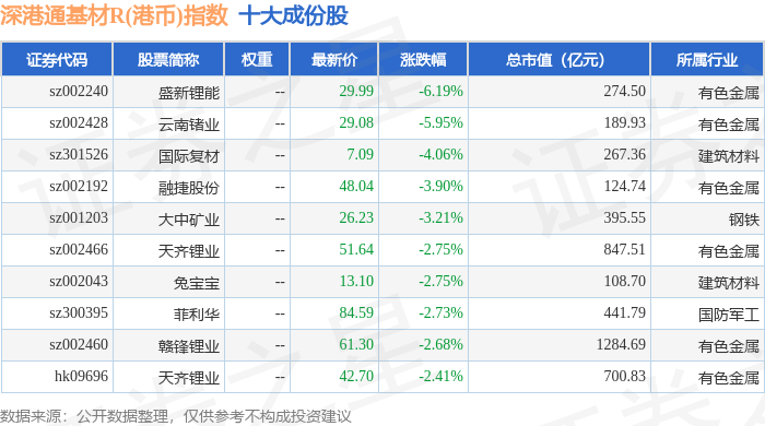 深港通基材R(港币)(483062)指数十大成份股详情如下: