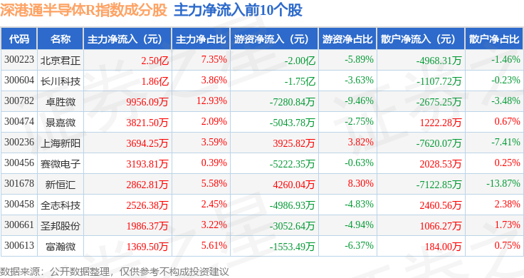 资金流向方面,深港通半导体R(483067)指数成份股当日主力资金净流入合计1.29亿元,游资资金净流出合计7.08亿元,散户资金净流入合计5.79亿元。成份股资金流向详情见下表: